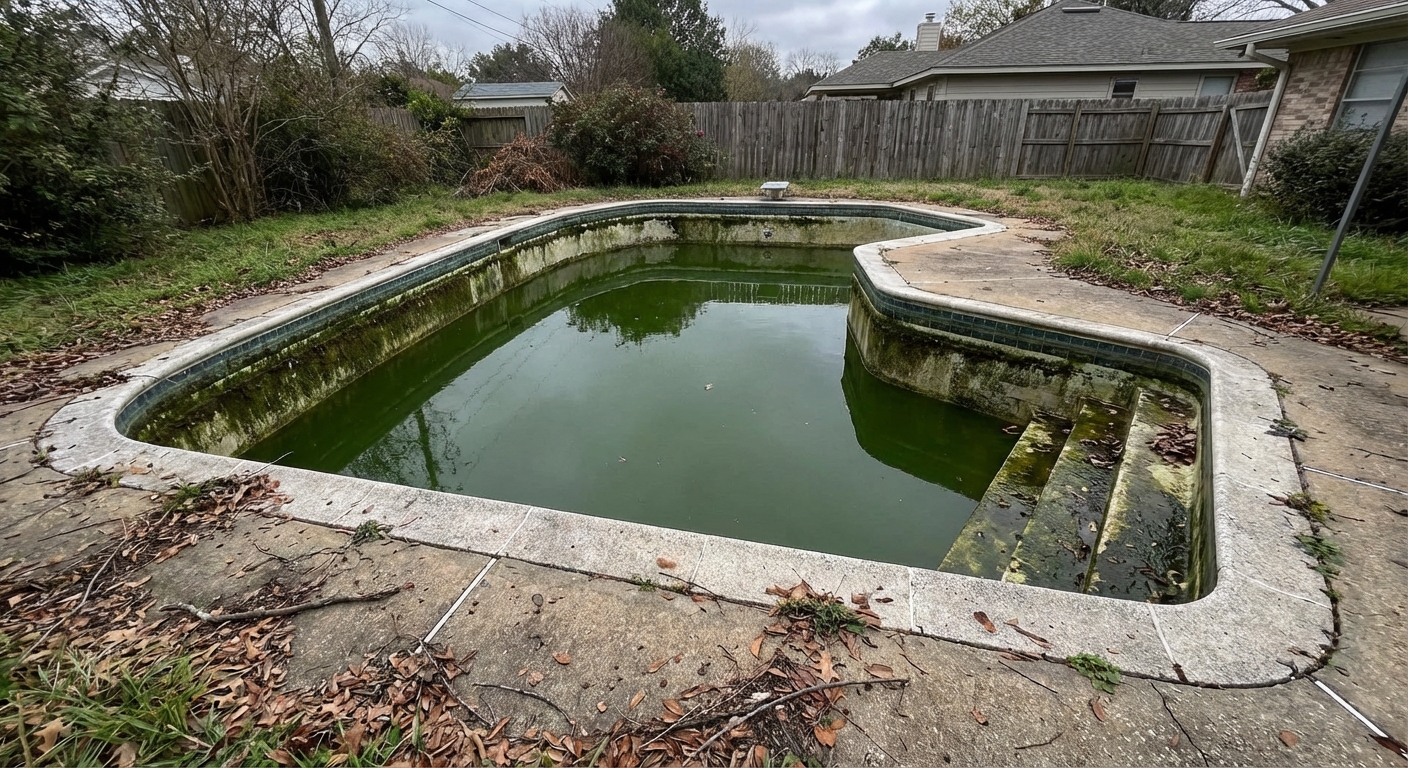 Snap the pool before treatment — green water, calcium, or dirty tile.